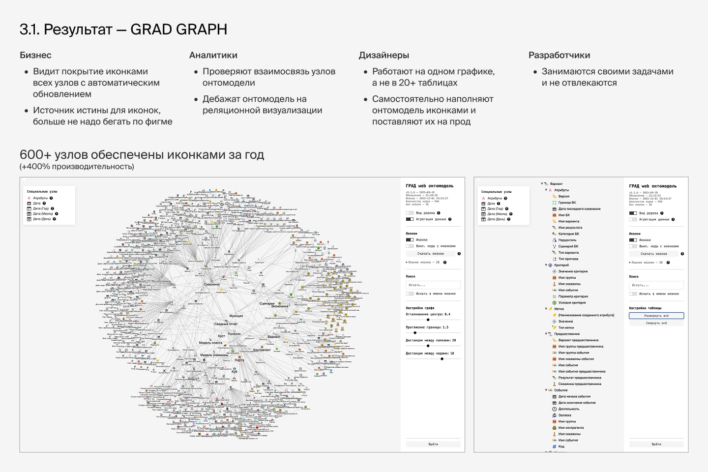 Чуть меньше года я развивал и вёл этот проект. Не слишком много времени на него уходит, но радует, сколько времени и сил мы сэкономили с командой при помощи нейронок. Если про ключевую пользу говорить: мы смогли понять общий объём работы (что бесценно само по себе), а затем научились управлять поставкой сотен иконок на сотни же узлов данных. А ещё это просто красиво)