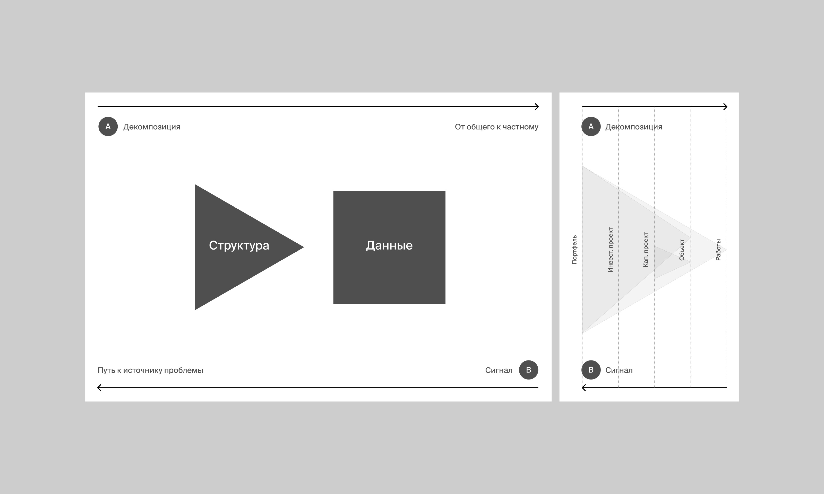 «Об общего к частному» — концептуальная модель проекта. Задаёт правила работы интерфейса. Весь поток данных группируется на пяти уровнях, навигация по которым строго линейная. Это снижает когнитивную нагрузку на пользователя, а перед глазами всегда только нужные данные.