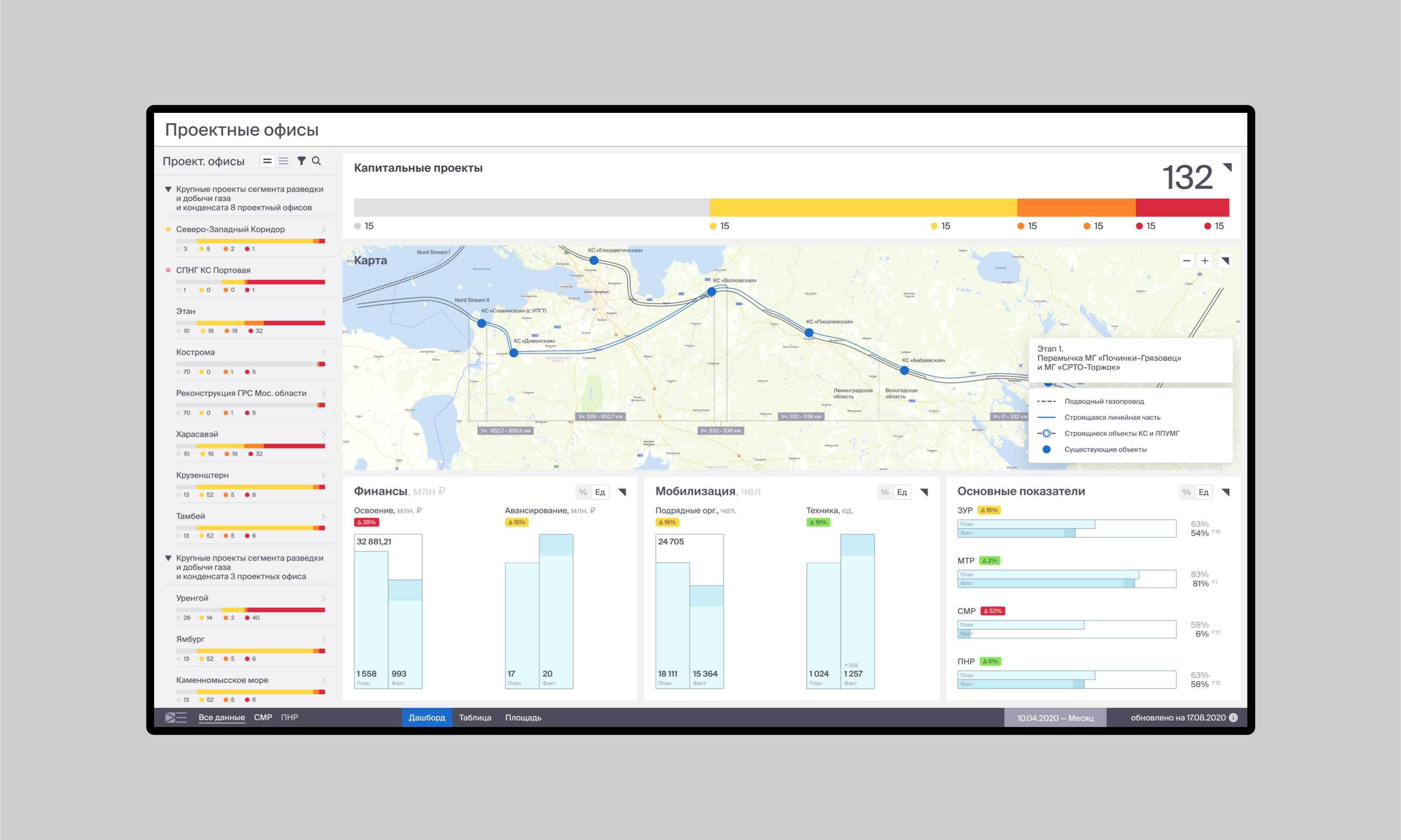Первый уровень навигации — проектные офисы. Различные виджеты визуализации данных.