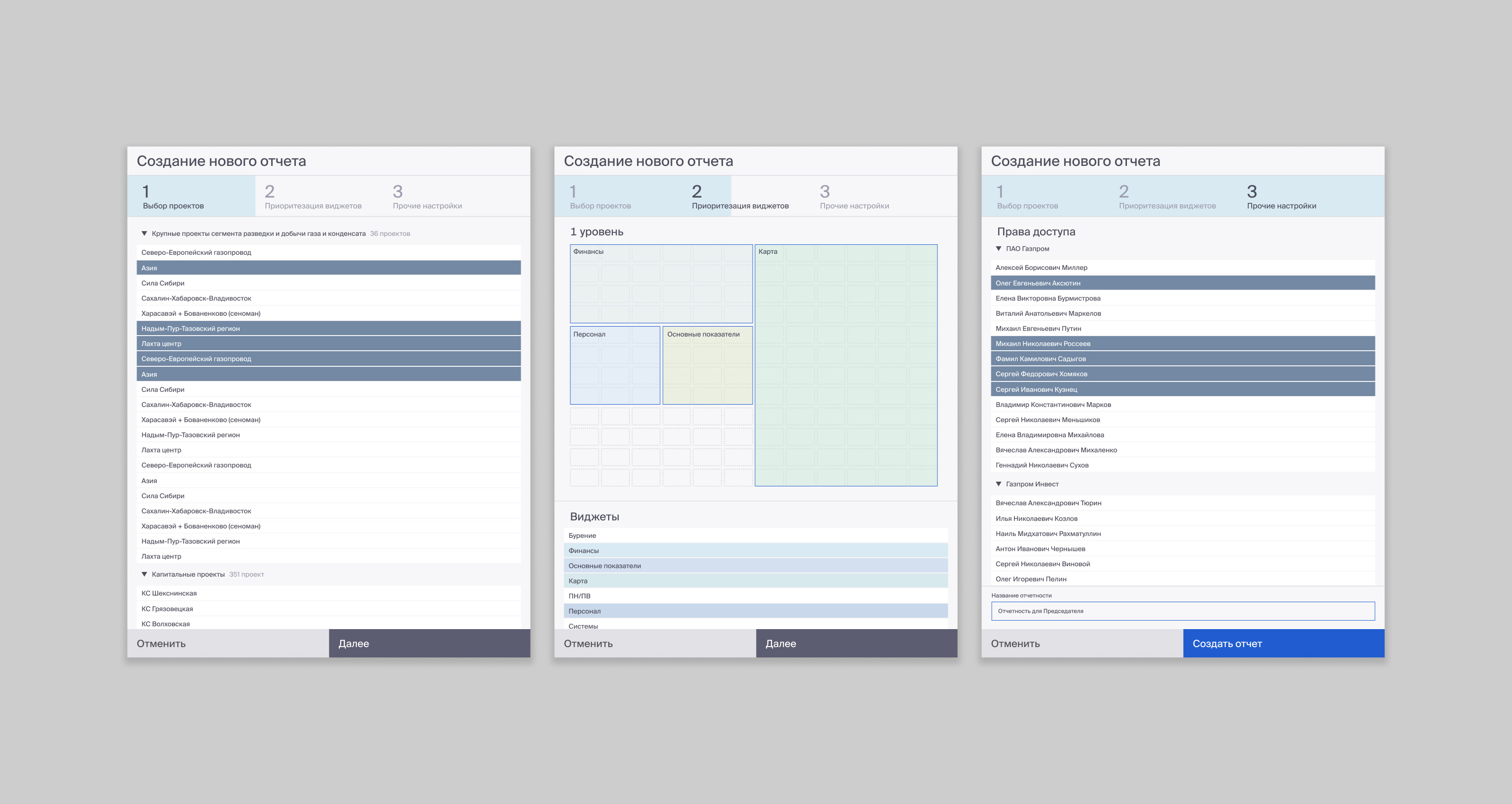 Панели сборки отчета. Версия не пошла в работу и осталась на стадии концепта, согласованного заказчиком.
