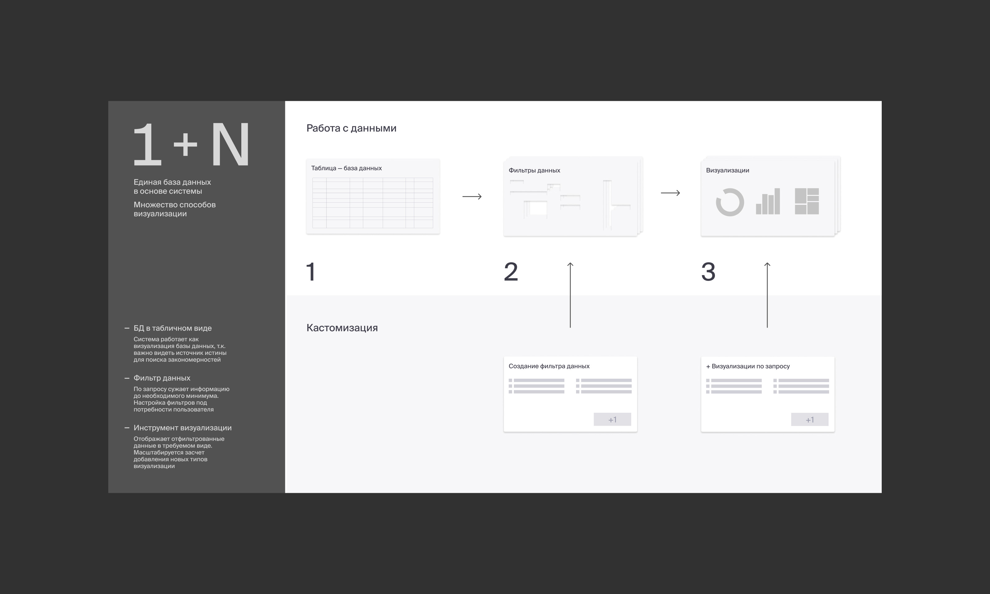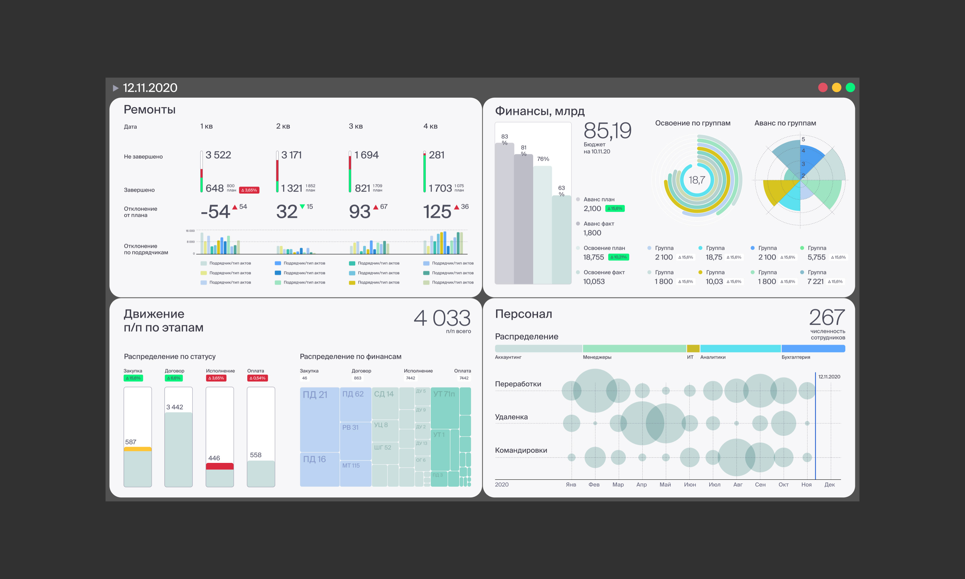 На основании отчётности был в эскизе оформлен концепт единой базы данных — дашборд руководителя. Состоит из виджетов, отображающих важнейшую информацию по выбранным фильтрам. Пользователь — старший руководитель.