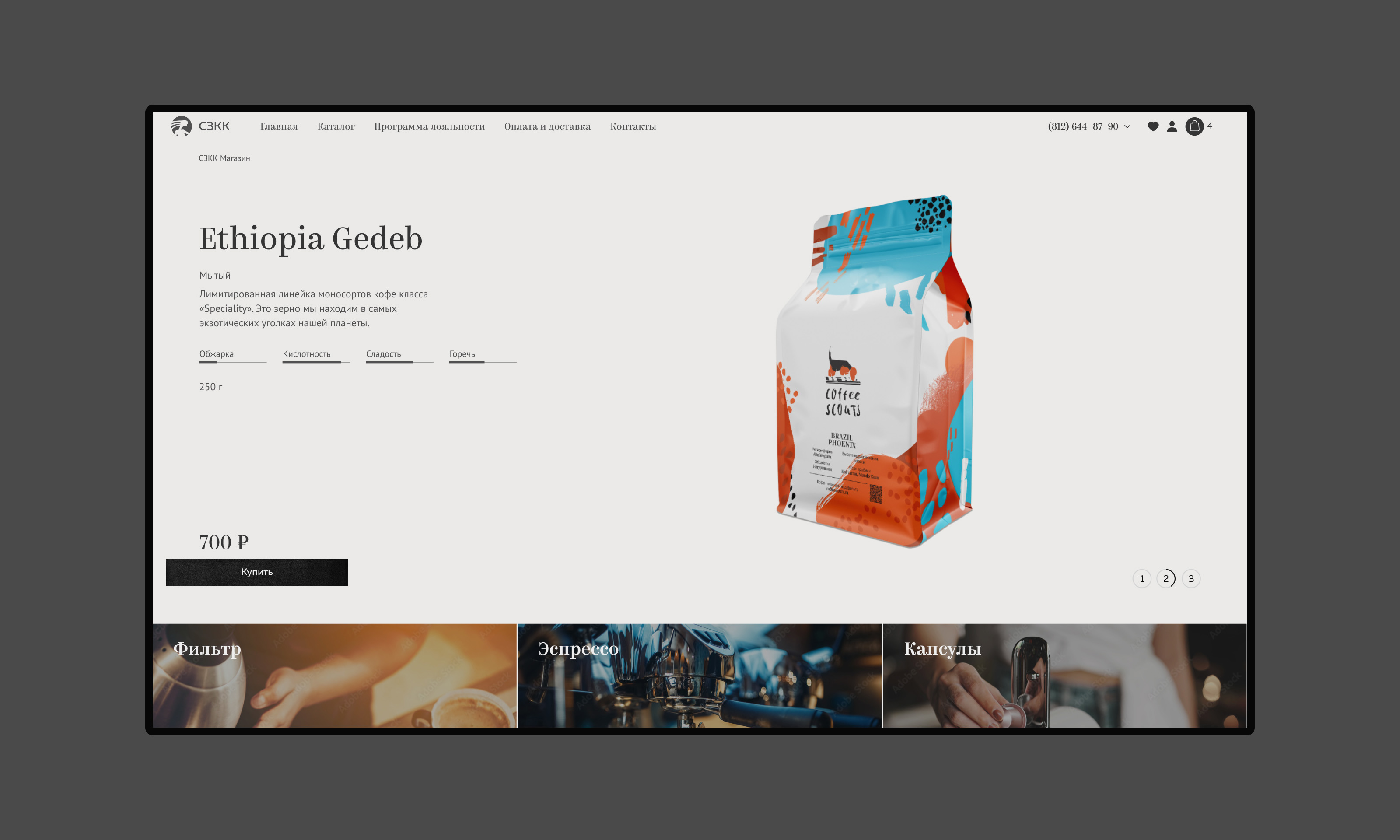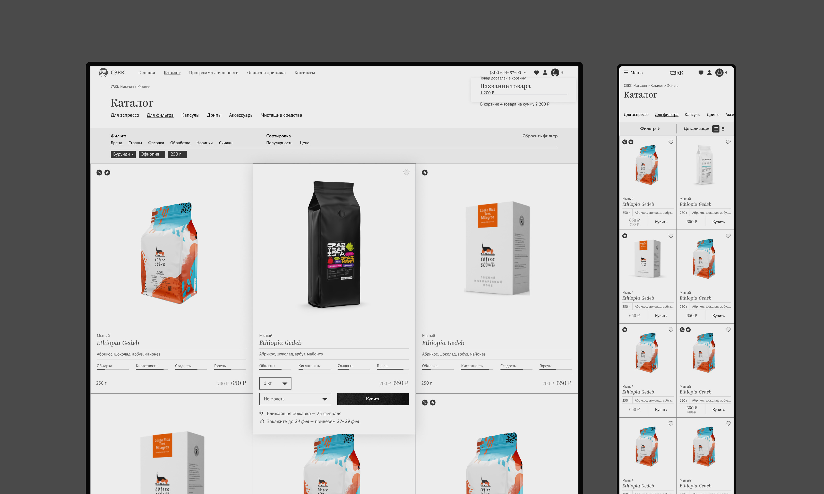 Через какое-то время после запуска проект перешёл в продажу спешелти кофе свежей обжарки, поэтому была реализована премиальная упаковка.