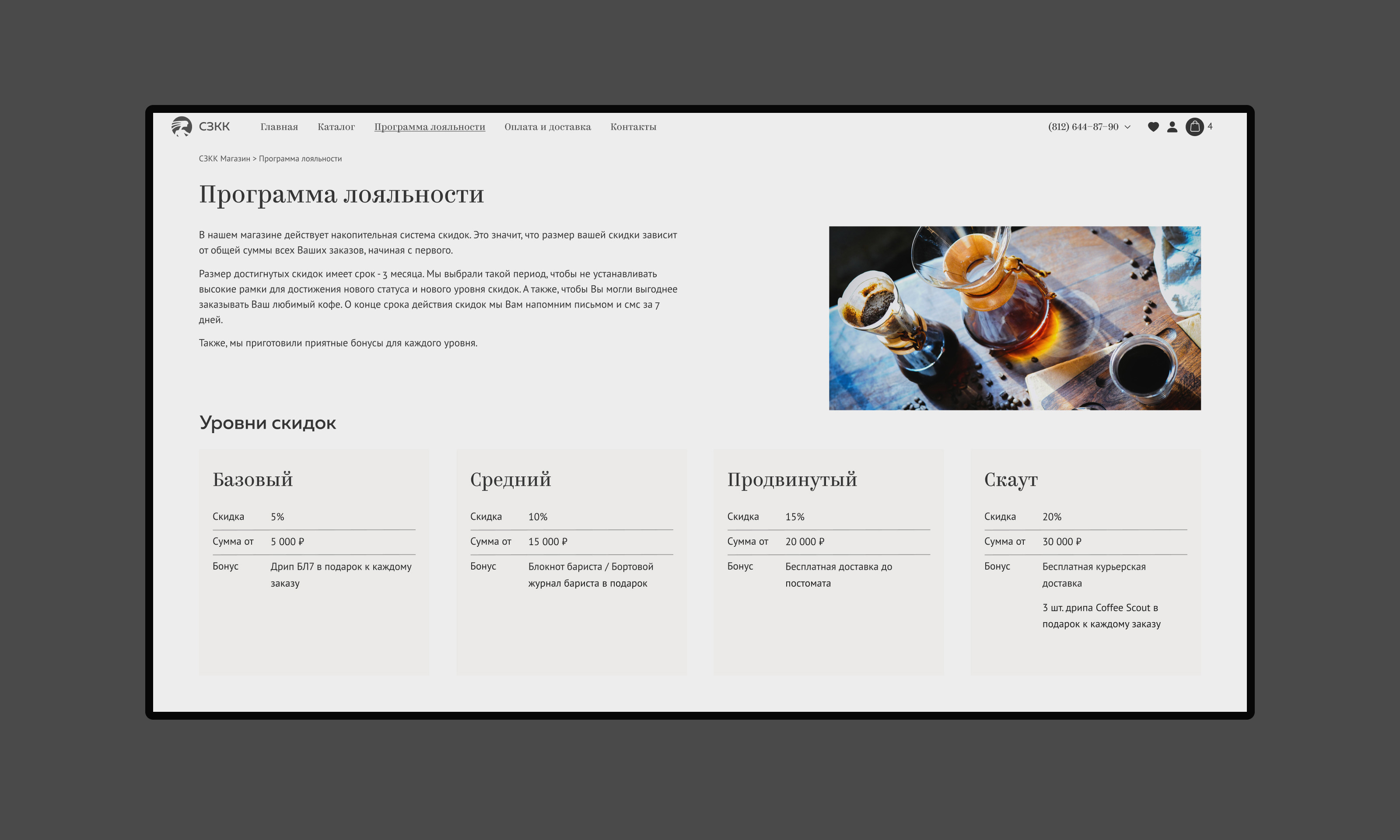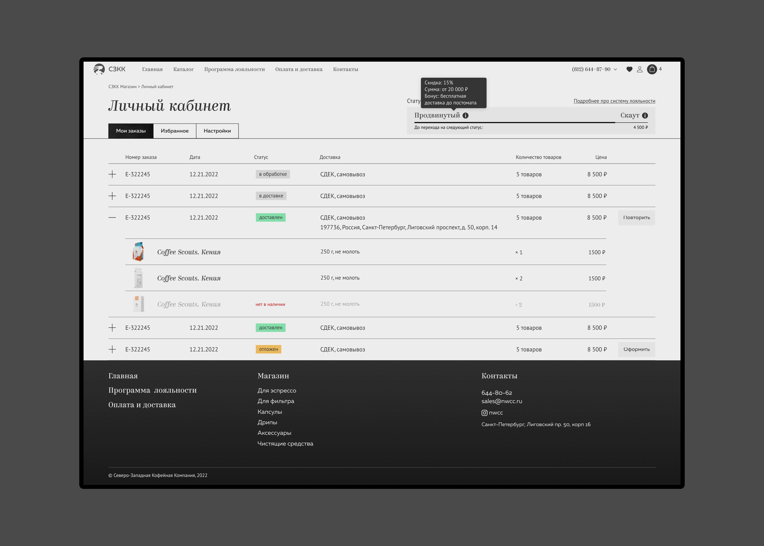 Один из самых объёмных проектов компании. Кофе Скауты — это сервис подписки на кофе. Я создал брендинг, сайт, с заказчиком продумал концепцию работы сервиса и помог встроить в рабочие процессы компании.